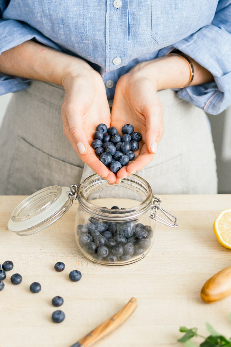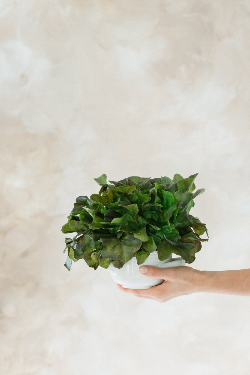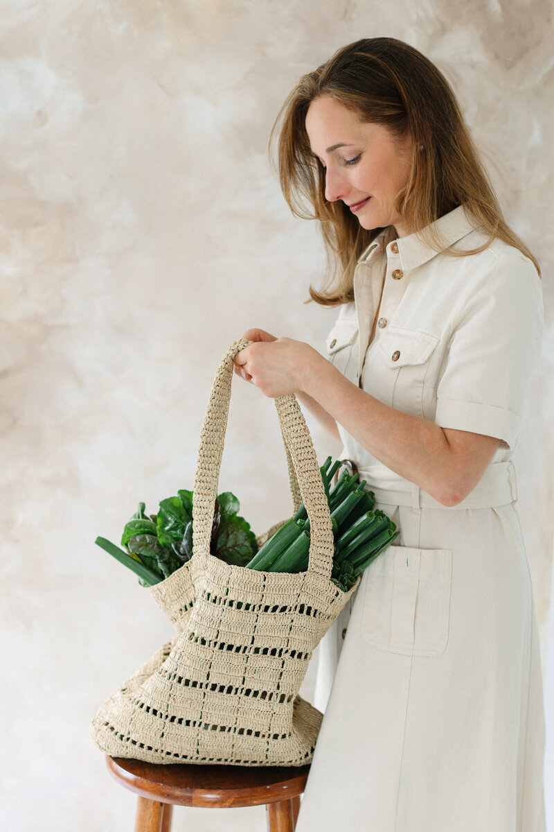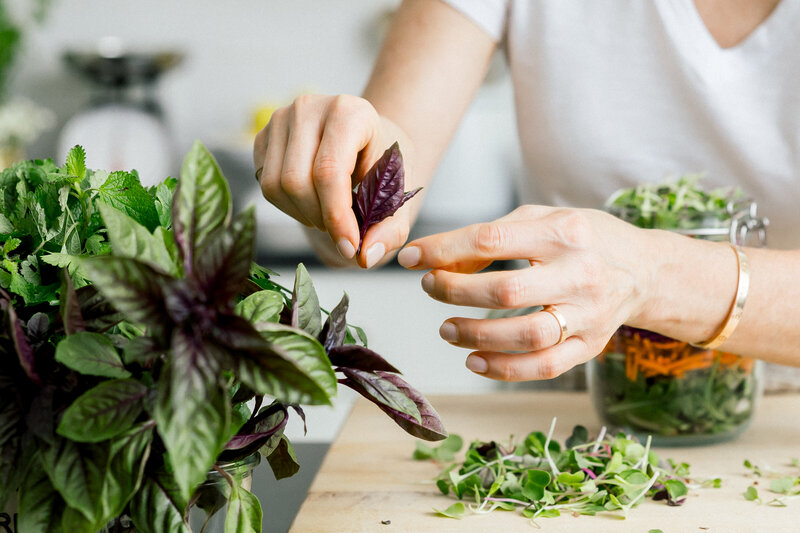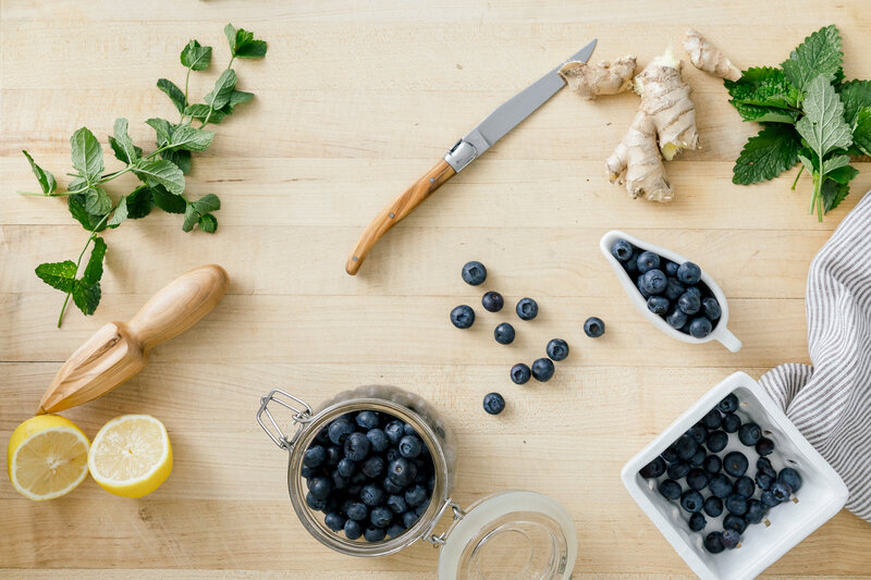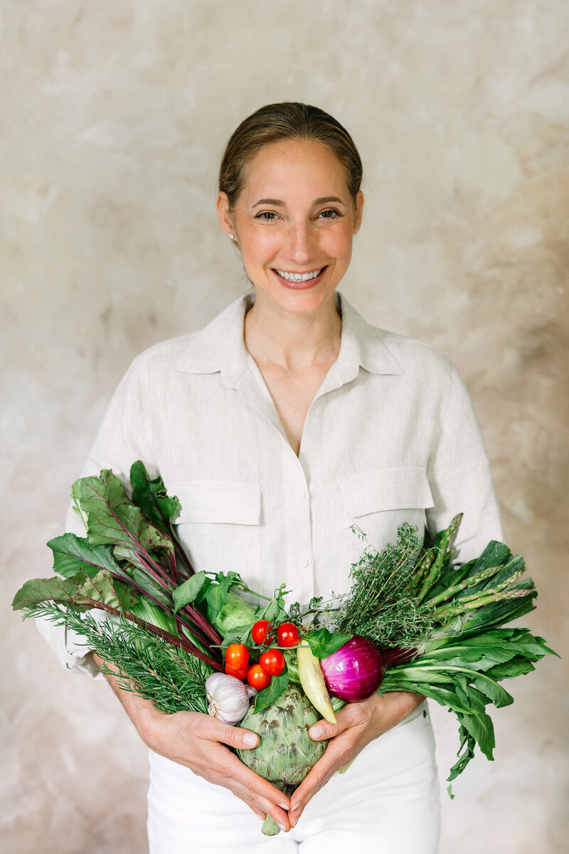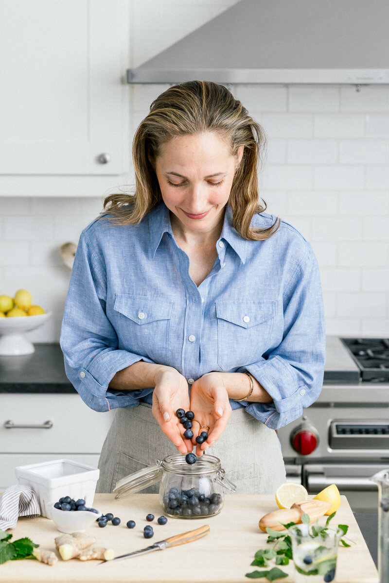 Since Betty is an avid cook and gardener, we incorporated both into her session. One concept had her preparing vegetables in the kitchen for a salad, making a pitcher of fruit-infused water, and creating meal plans for her clients.